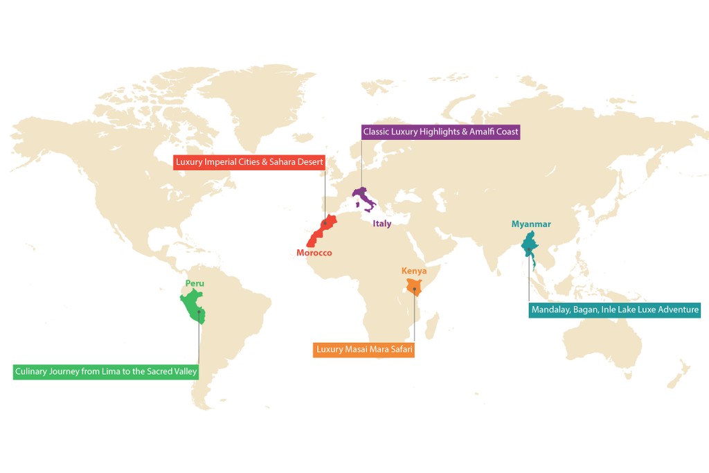 Treat yourself in 2020 with a luxury trip to an unexpected destination. Glamp under the stars in the Moroccan Sahara, take a sunrise hot air balloon ride in Myanmar, enjoy haute cuisine in Lima’s world-renowned restaurants, and stay in exclusive safari lodges in Kenya’s top game reserves. Or, redefine a classic Italy itinerary with private tours of major attractions in Rome and Florence, a helicopter flight over Mt. Vesuvius, and a luxe yacht cruise to glittering Capri.