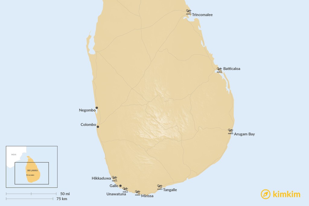 If you’re looking to spend a little time laying out on any of Sri Lanka’s waterfront shores, there are numerous beaches to choose from. Which one you end up at will likely depend on the time of year you travel and on the overall route of your tour.