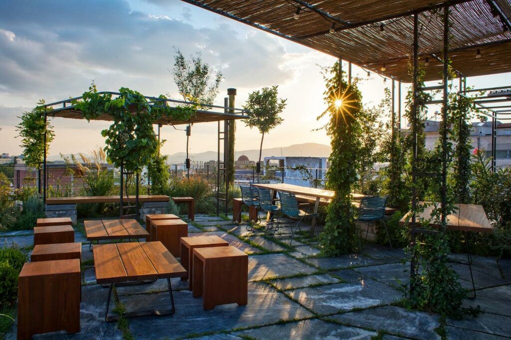 **Athens** hotels are renowned for their breathtaking rooftop **Acropolis** views, and **The Foundry** in **Psyri** distinguishes itself by offering an experience that is truly unparalleled. Stepping onto The Foundry’s rooftop is akin to entering a secret garden, where potted plants give way to trees, herbs, and flowers planted directly into the soil lining the roof. This innovative design creates a lush paradise, a verdant escape from the bustling city below.