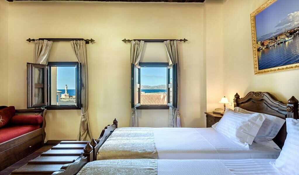 Facilities include a ground-floor restaurant and bar with stunning harbor views, as well as a convenient parking lot. Parking in Chania can be a challenge, especially during the high season, making the hotel’s parking lot a significant advantage.