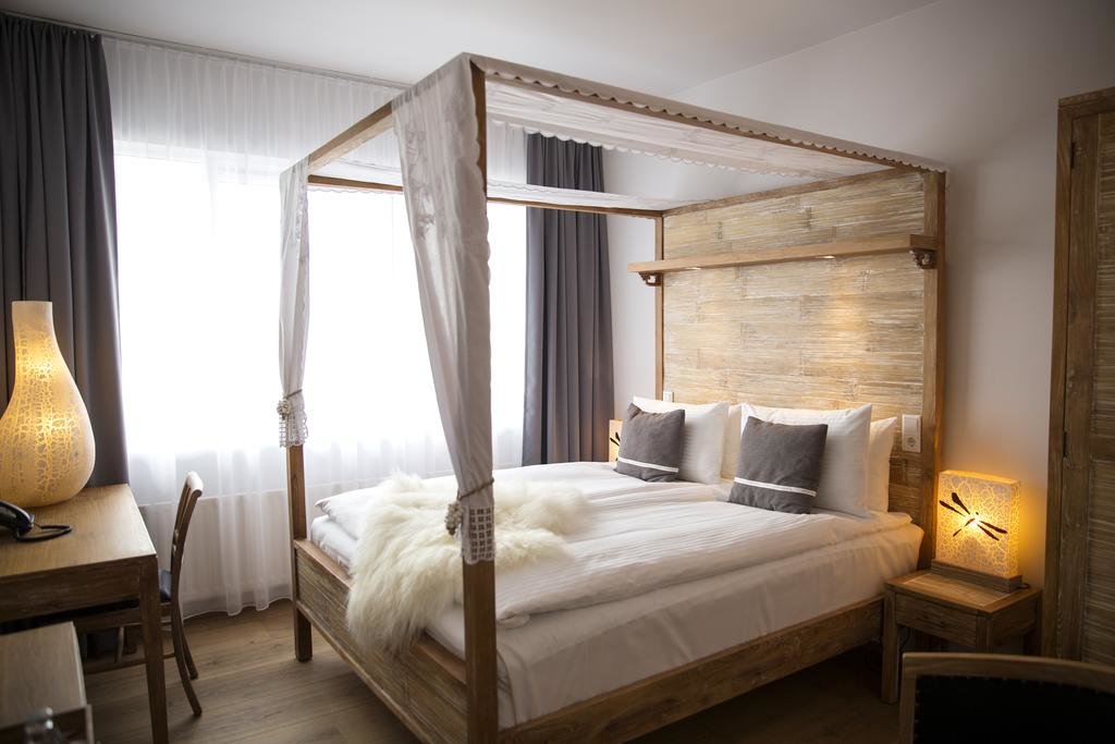 After a day of venturing out and exploring the captivating Icelandic capital, the **Eyja Guldsmeden Hotel** extends a warm welcome, providing a cozy and stylish retreat. The rooms at the Eyja Guldsmeden Hotel are thoughtfully designed to be both stylish and snug, creating a haven of comfort and relaxation. The rooms feature distinctive four-poster beds, adding a touch of romance and luxury, while natural sheepskin and cowhides are tastefully strewn throughout, enhancing the earthy vibe and adding a touch of Icelandic character.