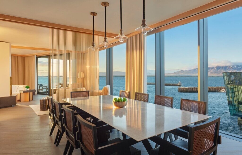 Some rooms boast breathtaking views of **Esja Mountain** and the vast expanse of the water, allowing guests to wake up to the stunning natural beauty of Iceland.