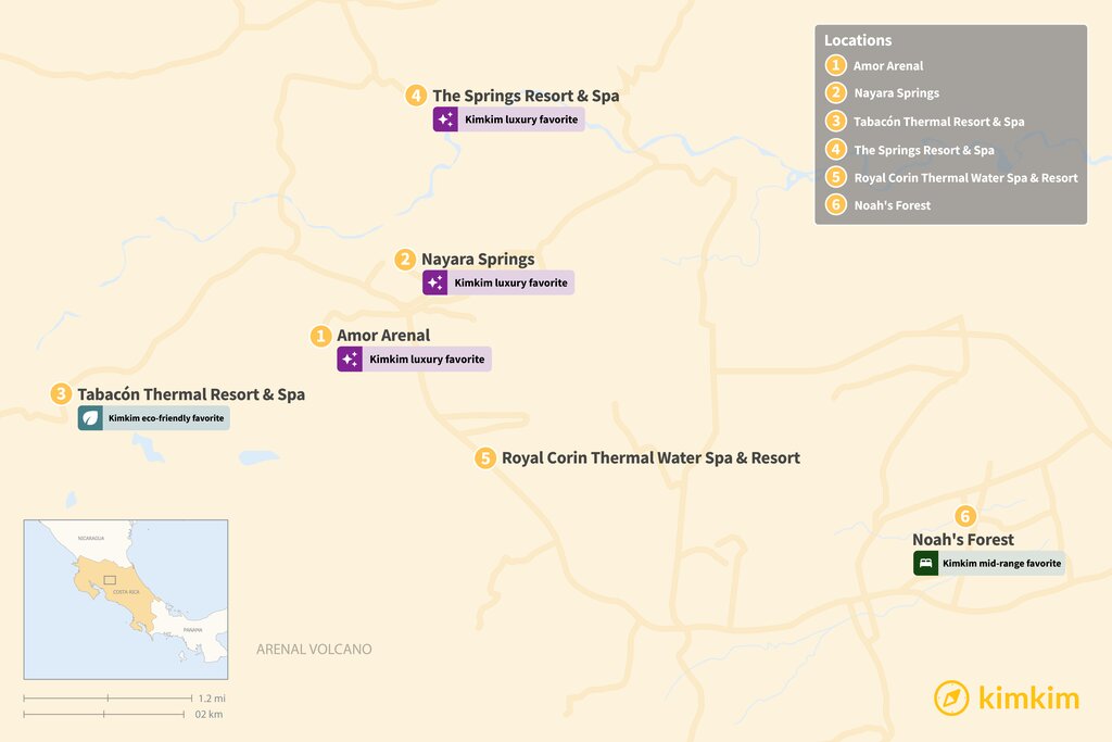 Arenal/La Fortuna offers a romantic mix of beautiful scenery, relaxing hot springs, and cultural activities—an ideal spot for a honeymoon or getaway with your partner. Our recommendations for the best hotels for a bit of romance include luxury stays where you get your own private bungalow and plunge pool, plus other properties surrounded by the Costa Rican jungle with fine-dining eateries and secluded hot springs.