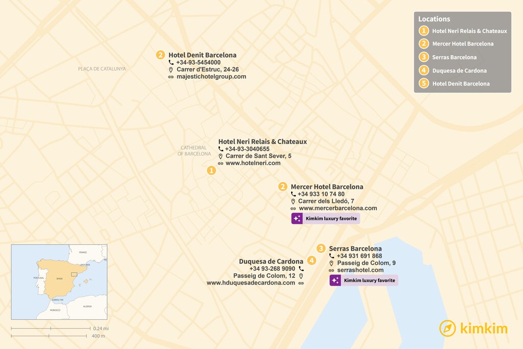 The Hotel Neri Relais & Chateaux boasts an enviable location that allows guests to easily explore Barcelona’s historic center on foot. Within a short stroll, you’ll find iconic landmarks such as the awe-inspiring Barcelona Cathedral, the charming **Calle del Bisbe** with its famed Gothic bridge, the vibrant Barceloneta beach, and the bustling La Rambla.