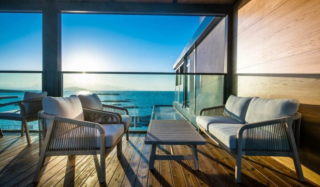 Each room within the **Ambassadors Residence** showcases locally crafted, customized furnishings and distinctive designs that highlight the unique characteristics of its designated material. The glass room features wraparound windows that offer sweeping panoramic views of the sea, while the Vitraux suite showcases colorful stained-glass light fixtures that cast a warm and inviting glow. The ADA-compliant paper suite is thoughtfully outfitted to cater to guests with wheelchairs, ensuring accessibility and comfort. For larger parties, connecting rooms are available, providing ample space and flexibility. The rooms are generously sized and innovatively designed, appealing to a wide range of travelers. Couples will find themselves captivated by the romantic atmosphere, while children will be enthralled by the intricate and imaginative designs.