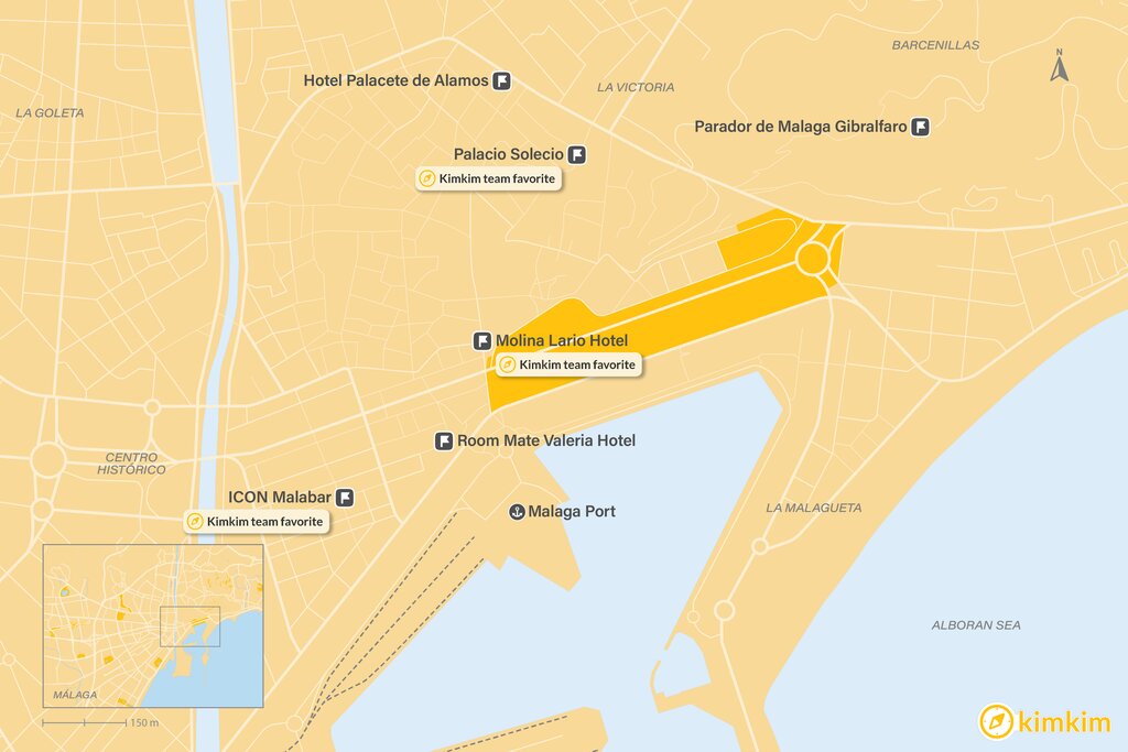 The hotel enjoys a near-perfect location at the end of the historic street **Calle Molina Lario** and the start of Málaga Park, across the street from the waterfront promenade Paseo del Muelle Uno. This location straddles the old and new, offering a little bit of everything, from gourmet restaurants and international shopping to local hangouts and artisan shops tucked down charming corners. You’ll be within walking distance of all the major sites, including the **Cathedral**, **Picasso Museum**, **Alcazaba**, and Castillo de Gibralfaro.