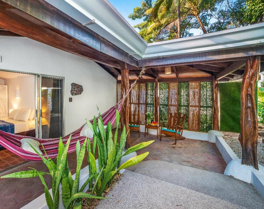 Features a delightful outdoor pool nestled amidst lush jungle scenery, creating a tranquil atmosphere. Managed by hands-on and friendly owners who are dedicated to ensuring a memorable stay for every guest. Conveniently located within walking distance of both the beach and the bustling downtown area of Tamarindo. Provides bright, clean, and well-maintained rooms, with some offering private terraces and relaxing hammocks. |