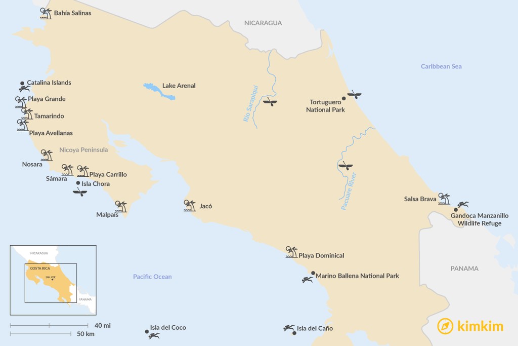 Moving towards the central Pacific coast, you’ll find the popular town of Jacó. This bustling hub offers a mix of surf schools for beginners and more challenging breaks for experienced surfers, ensuring that everyone can find their perfect wave. Jacó also boasts a wide range of accommodation options, delectable dining experiences, and a vibrant nightlife scene. Further south along the coast lies the more rustic Playa Dominical, which perfectly embodies the quintessential Costa Rican surf town. With its authentic fishing-village atmosphere, lively local bars, and affordable yet healthy food options, Playa Dominical offers a true taste of the local culture.