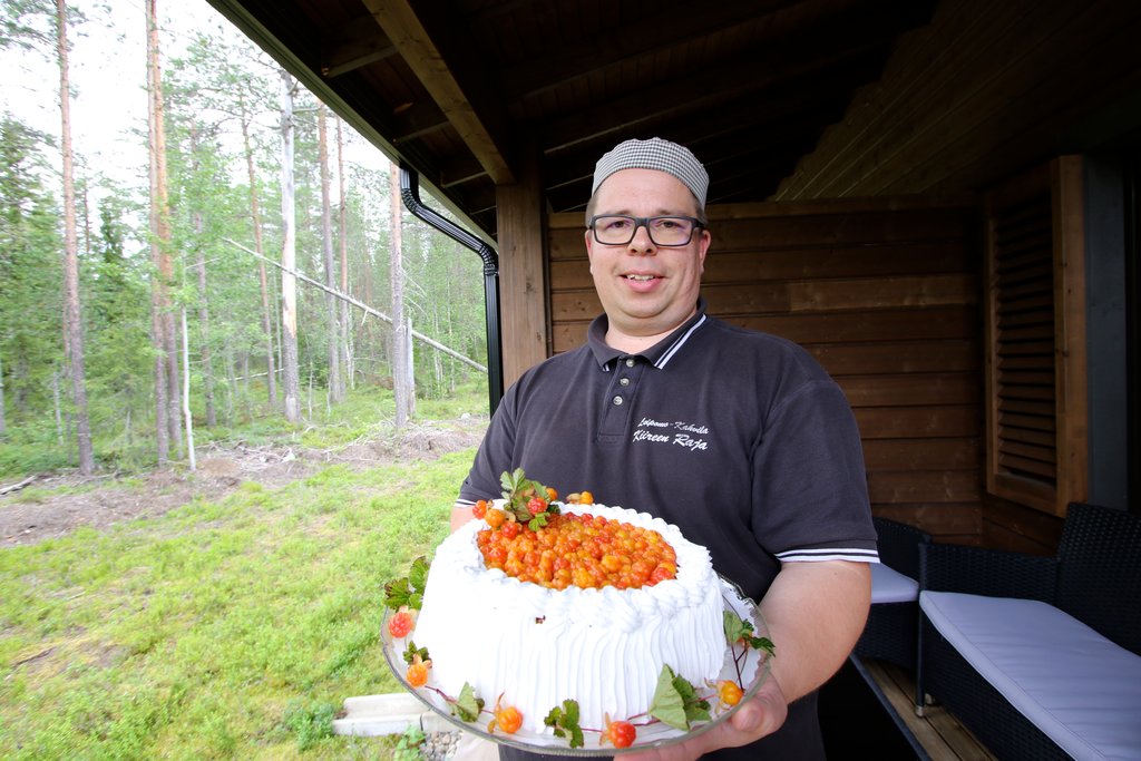 A talented baker proudly displays a fine example of a cloudberry cake, a testament to the berry’s culinary versatility