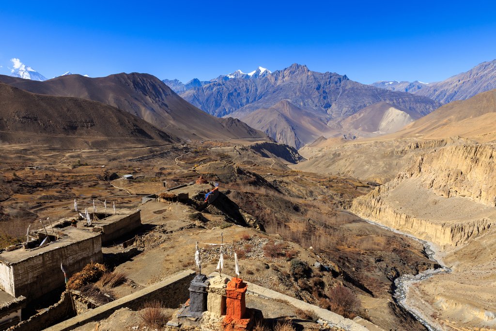 The walk to Tiri, situated at an elevation of 9,186 ft (2,800 m), from Kagbeni typically takes between 30 and 45 minutes. To reach Tiri, simply cross the bridge in Kagbeni and follow the only path heading north, towards the verdant terraced farmland that punctuates the landscape. This path is unpaved and can be somewhat rough, but you’ll likely only encounter the occasional motorbike along the way. From the small village of Tiri, ascend the steep path leading to a monastery that offers unparalleled views of the Kali Gandaki river, the stark and rocky hills, the snow-capped Himalayan peaks, and the distant Upper Mustang. As you journey through this region, take note of the distinctive color scheme of the Buddhist chortens found in Mustang, characterized by the prominent use of white, red, and blue-gray. These colors are unique to this region and add to the visual splendor of the landscape.