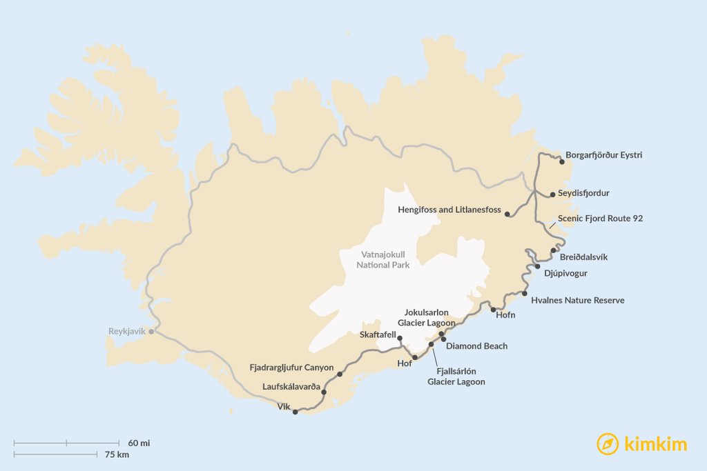 The Drive from Egilsstaðir (east) to Vik (south) offers some incredible scenery past calm fjords, thundering waterfalls, beaches with interesting formations, cool cliffs, and spectacular canyons. While it’s possible to drive this stretch in a single (long) day, you would miss some of the best places that Iceland has to offer. Slow down, enjoy the journey, and spend your time exploring the unique places below.