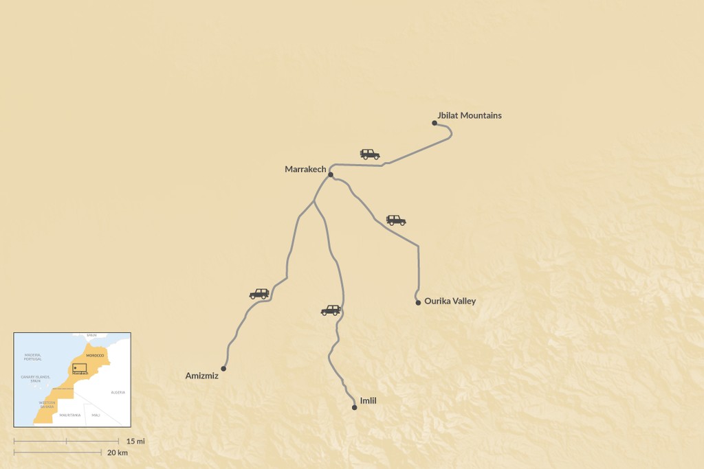 Your adventure begins as you head south from the bustling city, traversing the expansive Marrakech Plain, a landscape dotted with flourishing olive groves and bountiful fruit orchards – a truly surprising and delightful sight in what is classified as a semi-desert zone. As you continue, the imposing High Atlas mountain ridges and formidable summits gradually begin to dominate the horizon, signaling your imminent approach to the welcoming embrace of Amizmiz.