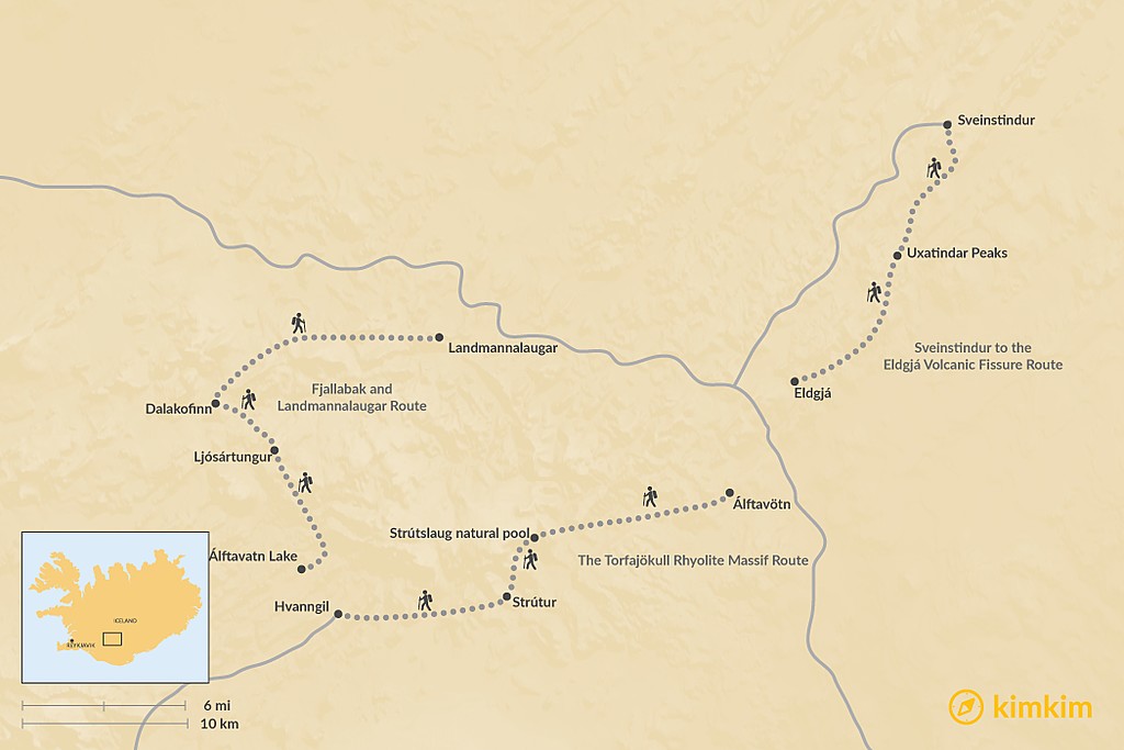 In the course of just a few days, you will ascend majestic mountains, immerse yourself in naturally heated hot springs, gaze upon enigmatic lakes and glaciers, and uncover an entirely new facet of Iceland – a side that remains largely unseen by the typical tourist. These remarkable trails will guide you from the summit of Sveinstindur mountain, a vantage point that, on a clear day, presents arguably the most stunning panoramic views in the entire country, all the way to Landmannalaugar, situated within the Fjallabak Nature Reserve. Landmannalaugar is a geological wonderland characterized by its strikingly colorful rhyolite mountains. The entirety of the Volcanic Trails route stretches for an impressive 80 miles, requiring approximately nine days to complete in full. However, the route can be conveniently divided into three distinct, shorter itineraries, each ranging from three to five days in duration, allowing for a more tailored and manageable hiking experience.
