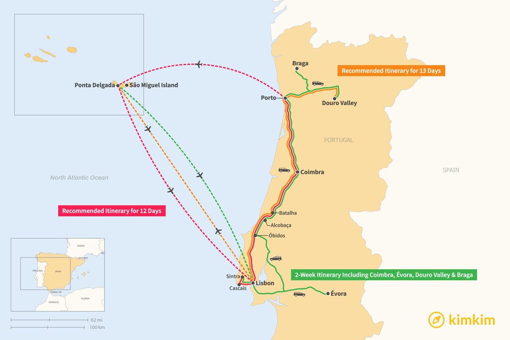 Most travelers to Portugal will find that 10 to 13 days is perfect for a well-paced trip with stops in Lisbon, Porto, and São Miguel. It’s also possible to hit the highlights in nine days if you like a fast-paced journey. With more time, however, you can enjoy extra activities at each stop or a few days in another region like Coimbra, Douro Valley, or Évora. Keep reading for more inspiring Lisbon, Porto, and São Miguel itineraries.