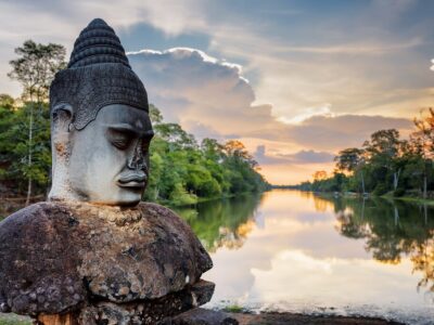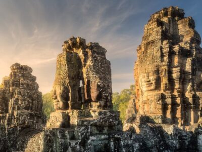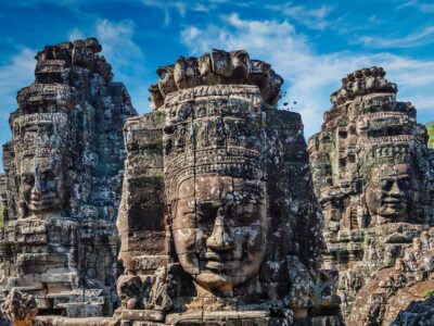 For an iconic Cambodian experience, tour the temples of the ancient city of Angkor. Additionally, there are many undiscovered off-the-beaten-path gems, like the untouched island beaches of Koh Rong and Koh Rong Samloem, the up and coming bustling city of Phnom Penh, and the 216 stone faces carved at Angkor Thom.