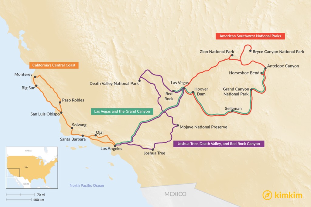 From the unique beauty of Joshua Tree, your adventure continues onward, beckoning you to explore the mesmerizing sandy dunes of the Mojave National Preserve, a hidden gem that showcases the raw, untamed beauty of the desert. As you traverse this captivating landscape, you’ll eventually arrive at the breathtaking Death Valley National Park. This extraordinary region boasts otherworldly landscapes that are unlike anything you’ve ever encountered. From the undulating badlands to the vast expanse of salt flats, you’ll be mesmerized by the spectacular scenery that unfolds before your eyes. Be sure to rise early and witness the stunning sunrises that paint the horizon with vibrant hues, creating an unforgettable visual spectacle. Your journey culminates with an exploration of the vividly colored rock formations of the aptly named Red Rock Canyon. Here, you’ll marvel at the natural artistry that has shaped these stunning formations over millennia. To add a touch of excitement to your trip, spend a couple of nights amidst the dazzling lights of Las Vegas before making your way back home, filled with memories of an incredible adventure.