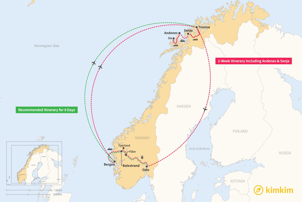 - Among the most popular and highly recommended extensions to this itinerary are the charming village of Flåm, the captivating island of Andenes, renowned for its whale watching opportunities, and the stunningly beautiful island of Senja, often referred to as “Miniature Norway” due to its diverse landscapes.