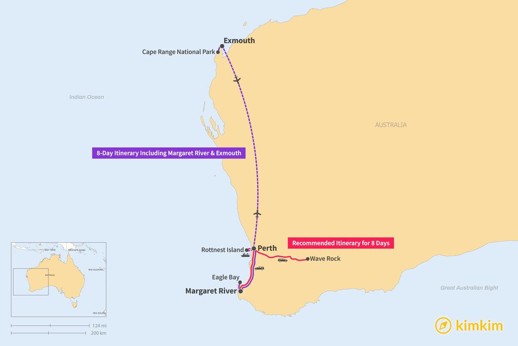 For a more extensive exploration of Western Australia, consider this eight-day itinerary that incorporates the highlights of Perth, Exmouth, and the Margaret River region.