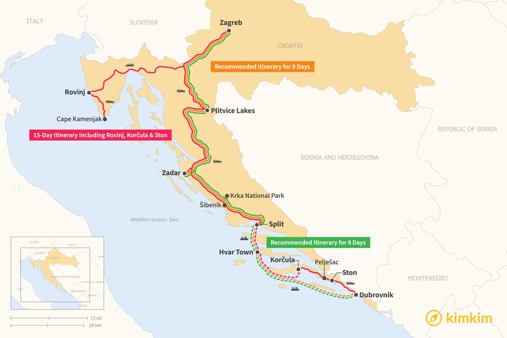 This extended itinerary offers a truly immersive experience of Croatia, allowing you to explore its diverse regions, historical cities, and stunning natural landscapes, from Zagreb to Dubrovnik, with stops at Rovinj, Plitvice Lakes, Zadar, Šibenik, Split, Hvar, Korčula, and Ston along the way.