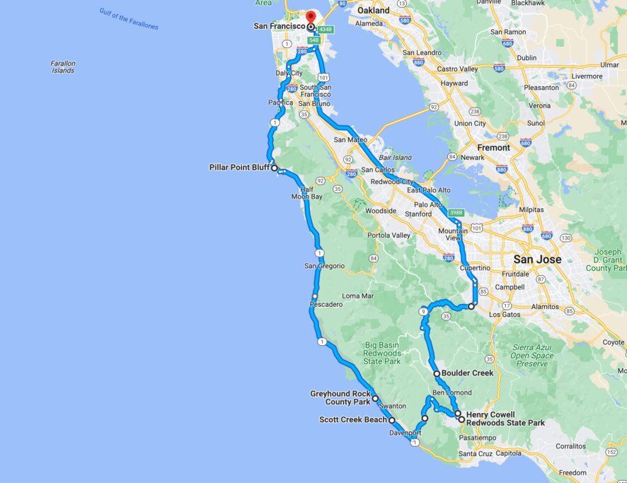 The stretch of coast between Santa Cruz and Pacifica (known to locals as the Slow Coast) is packed with amazing views, charming small towns, and beautiful beaches, yet despite its proximity to San Francisco is much less crowded than Big Sur and other famous sections of California’s dramatic coastline. The adjacent Santa Cruz Mountains also contain a number of fun diversions for outdoor lovers, allowing for the creation of a jam-packed day trip loop.