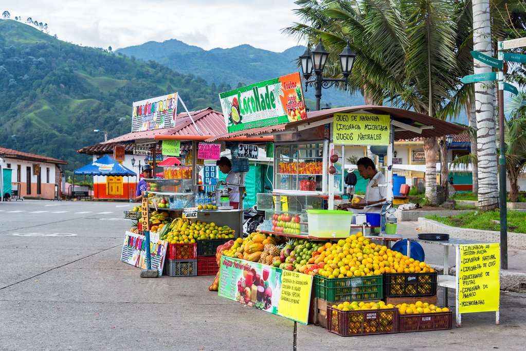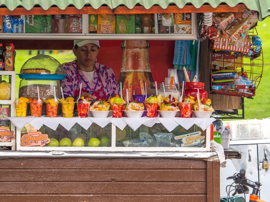 Last but not least is Colombia’s cornucopia of tropical fruits—banana, guava, mango, papaya, and watermelon just to name a few. In the highlands, you can add strawberries and other temperate fruits to the list. Cartagena is renowned for its *palenqueras*, Afro-Caribbean women in traditional dress who sell fruits from baskets carried atop their heads. But every city has vendors selling diced fresh fruits in plastic cups with a toothpick or plastic fork. Try a refreshing *mango biche*, shreds of mango doused with lime juice and salt and pepper! The sweet, tangy, and refreshing flavors of Colombian tropical fruits are the perfect way to end your street food adventure.