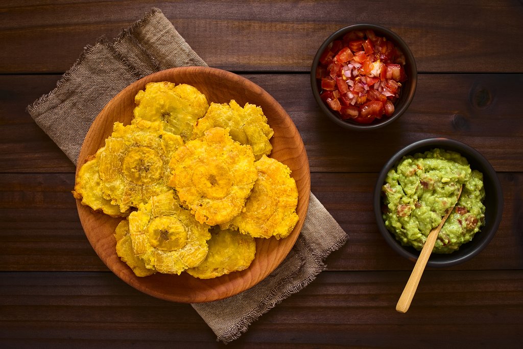 *Patacones* are a simple yet satisfying snack made from green plantains squashed flat into a patty and deep-fried. You’ll become familiar with them as a side dish to main plates in restaurants. But they’re commonly sold at street stalls and are sometimes topped with avocado and a savory *hagao* creole sauce of tomato and onion. The crispy exterior and the slightly sweet flavor of the plantain, combined with the creamy avocado and the savory sauce, make *patacones* a delightful snack.