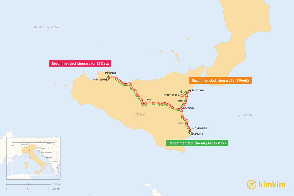 Most travelers will find that 13 to 15 days is perfect for a well-paced Italy trip to Sicily with stops in Syracuse, Taormina, Palermo, and Catania. It’s also possible to hit the highlights in 8 to 12 days if you don’t mind a fast-paced journey. See more ideas for Syracuse, Taormina, Palermo, and Catania itineraries below.