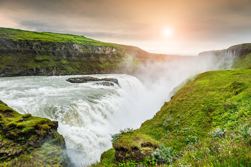 The majestic Golden Falls, known locally as Gullfoss, stands as Iceland’s second largest waterfall, cascading with a thunderous roar from a height of 105 feet. This natural wonder is a sight to behold, showcasing the sheer power and beauty of Icelandic landscapes. On a bright, sunny day, the mist generated by the falls fills the air with a mesmerizing glittering golden haze, creating an ethereal ambiance that will leave you spellbound.