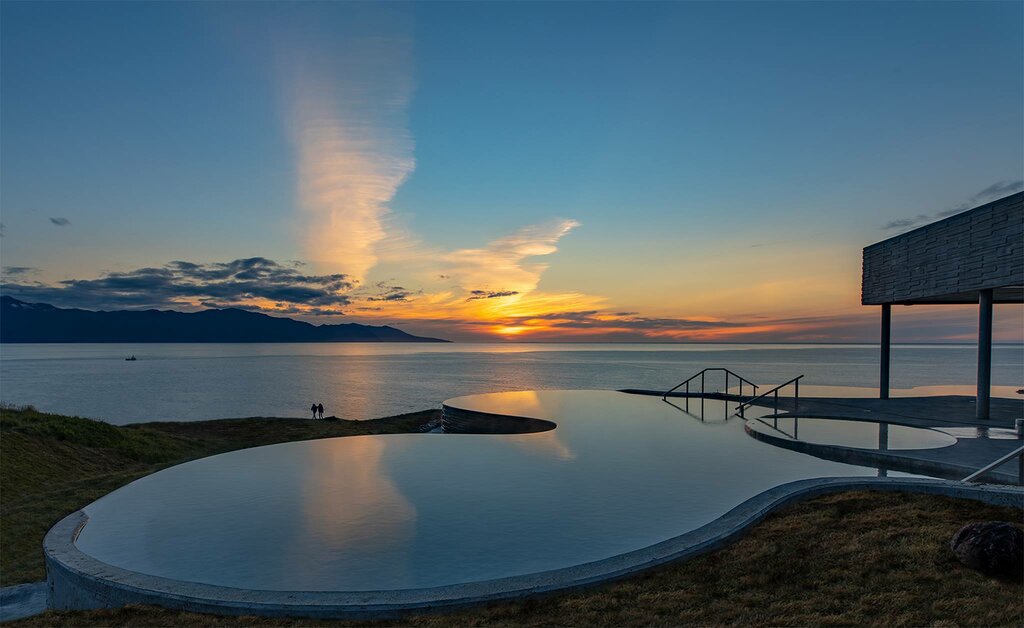 Another remarkable hot spring in Northern Iceland, the GeoSea Geothermal Baths represent one of the country’s newest and most modern facilities. Located near the charming town of Húsavík, this bath stands out for its use of mineral-rich seawater. The salty seawater is sourced from the same natural source that locals have utilized for centuries, now heated by the Earth’s geothermal energy. As you soak in the soothing waters of the pools, you’ll be treated to breathtaking views over Skjálfandi Bay and the Arctic Circle, a region renowned for its abundant marine life, including majestic whales.