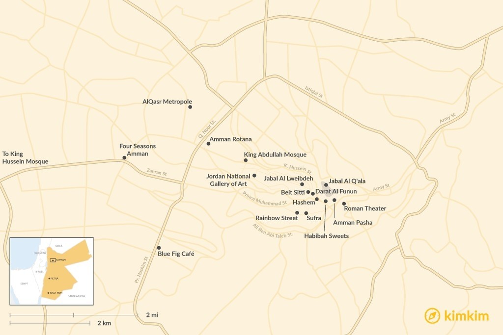 Strategically situated in Jordan’s mountainous northern region, Amman is uniquely defined by its seven distinct hills, locally known as “Jabals.” These Jabals serve as invaluable reference points for navigating the city’s diverse districts and neighborhoods. For instance, Jabal Amman encompasses a collection of affluent West Amman neighborhoods, exuding an air of sophistication and modernity. Jabal Al Q’ala, steeped in history, is home to the few remaining original ruins that whisper tales of Amman’s ancient past. In contrast, Jabal Al Lweibdeh has emerged as the epicenter of the city’s burgeoning arts scene, attracting artists, creatives, and art enthusiasts from all walks of life. Another helpful set of landmarks for navigation are the large and ubiquitous traffic circles that run along Zahran Street, numerically ordered for ease of orientation. A notable example is Rainbow Street, a popular destination located near Circle 1, making it easily accessible to visitors and locals alike.
