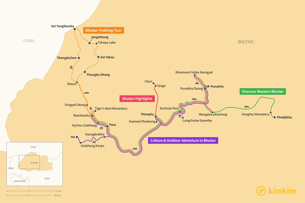 Map of 1 Week in Bhutan – 4 Unique Itinerary Ideas