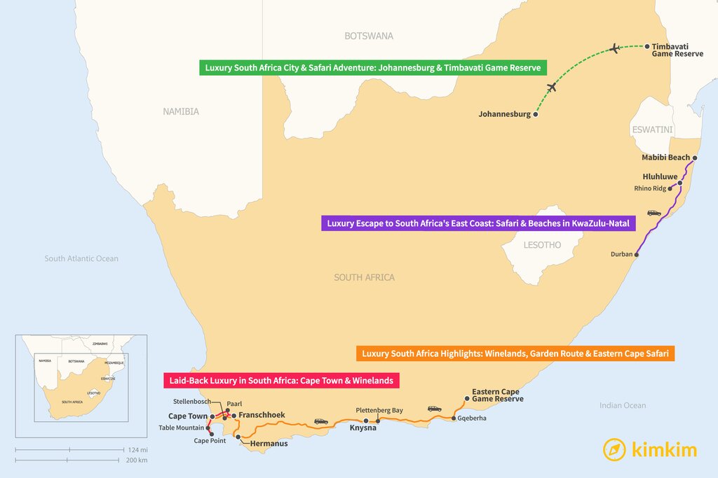 Map of 1 Week in South Africa – 4 Luxury Itinerary Ideas