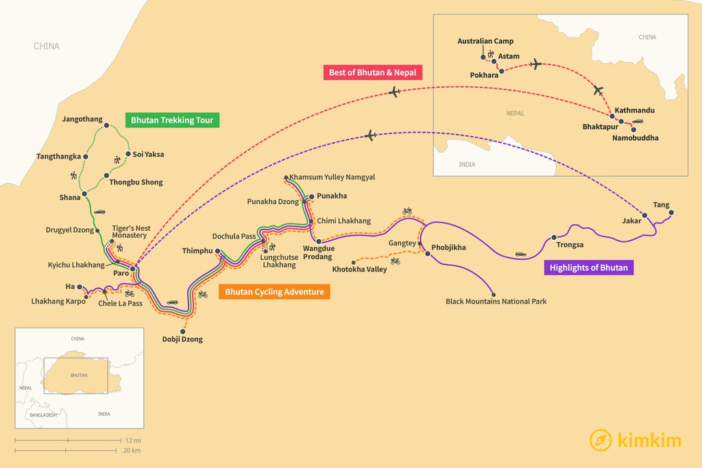 Map of 2 Weeks in Bhutan – 4 Unique Itinerary Ideas