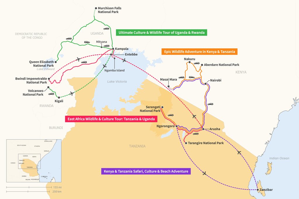 Map of 2 Weeks in East Africa – 4 Unique Itinerary Ideas