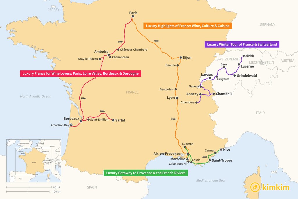 Map of 2 Weeks in France – 4 Luxury Itinerary Ideas