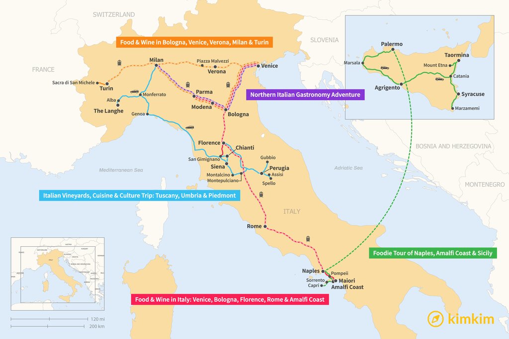 Map of 2 Weeks in Italy – 5 Food & Wine Itinerary Ideas