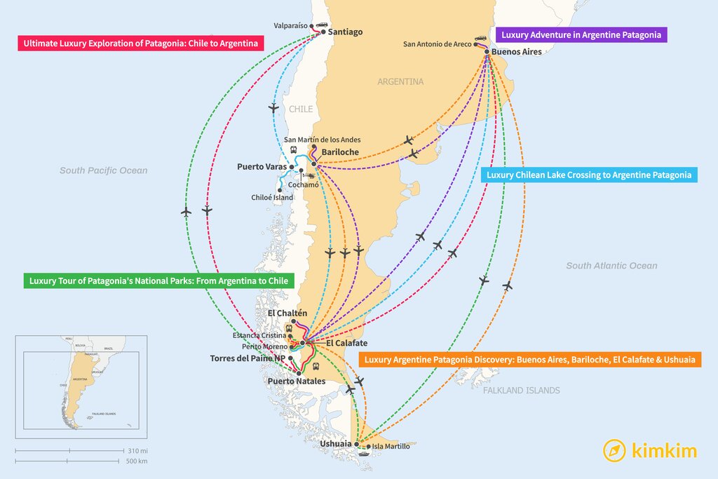 Map of 2 Weeks in Patagonia – 5 Luxury Itinerary Ideas
