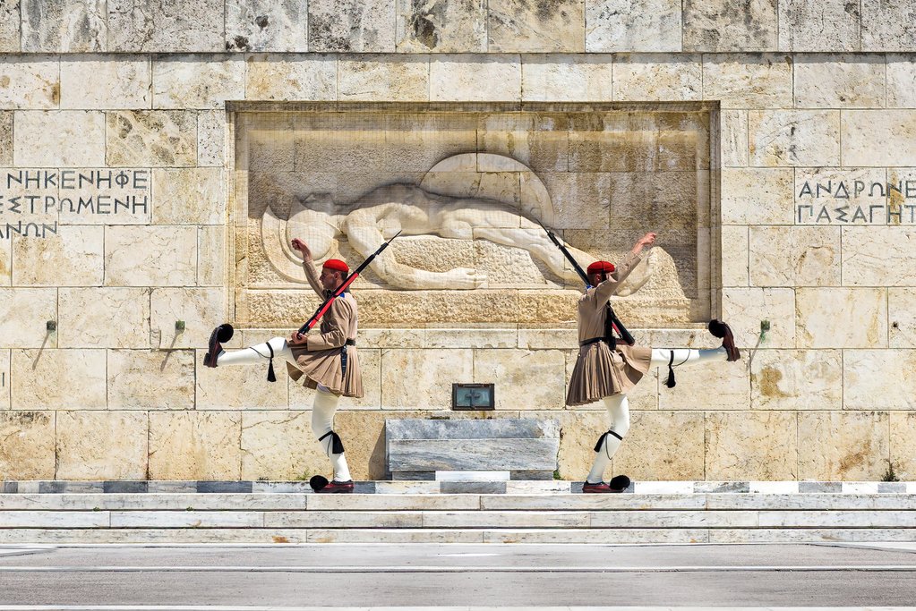 If possible, visit on Sunday, when the entire corps parades down Vasilissis Sofias, accompanied by a band. If you miss the parade on this timeline, not to worry—the ritual occurs at the top of every hour, 24/7. If possible, arrive no later than 10:45 am to gain a good vantage before the crowds gather.