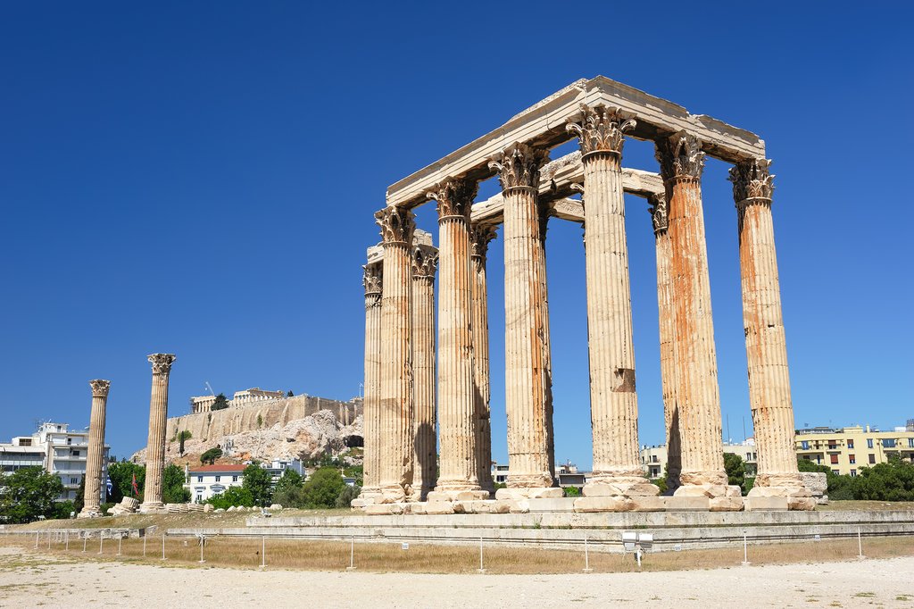 Initiated in the 6th century BCE, the Temple of Olympian Zeus was completed at the same time as the arch. Supported by 104 massive Corinthian columns—of which only 15 remain standing—it was the largest temple in Greece. It was vandalized during the Herulian sack of Athens in 267 CE, and in the ensuing centuries, much of the stone was repurposed as building materials. On one corner, 13 columns form a single unit, which will give you a sense of the mammoth scale of this once-monumental temple.