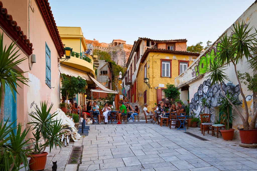 It should now be around noon. Cross Vasilissis Amalias and walk west on Lisikratous; turn right at the end of Lisikratous and follow Tripodon through the heart of the Plaka district. Laid out beneath the Acropolis, Plaka is the oldest and most atmospheric of Athens’ districts and an enclave oozing Greco-Ottoman charms. Its cobbled alleys are lined with market stalls emitting aromas of garlic, olives, and citrus, while the cafés brim with fresh-brewed espresso.