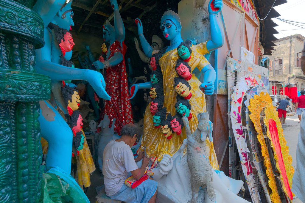 Next, hop in a taxi and make the short drive to Kumartuli. This area is where many of the city’s potters and craftspeople live and where the life-sized clay idols of the Hindu Goddess Durga (as well as other gods and goddesses) are constructed for use in the annual Durga Puja festival.