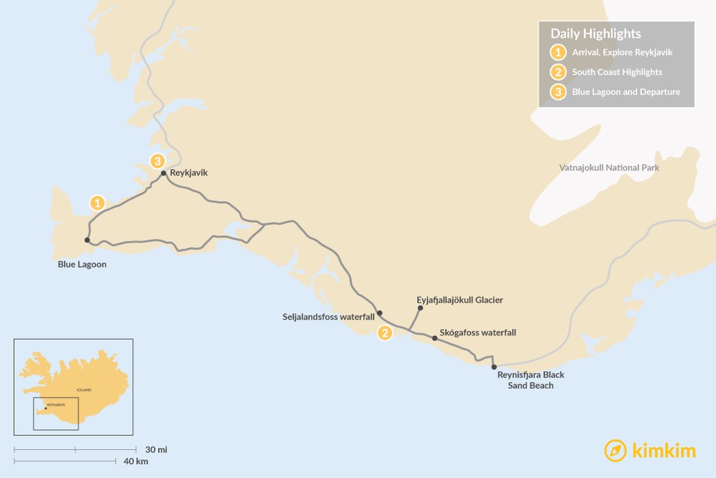 Map of 3 Days in Iceland: Blue Lagoon, South Coast, Reykjavik – 3-day itinerary