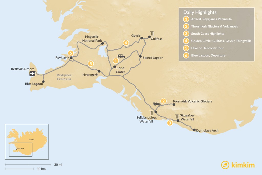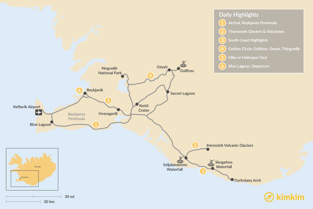 Map of 5 Action-packed days in South Iceland (+ extensions)