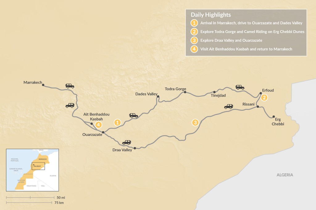 Experience Morocco’s stunning natural beauty and fascinating culture on this four-day trip to its mountains, deserts, and oases. Ride camels in the Sahara, roam the maze of passageways in a classic kasbah, and hike through a river gorge. Along the way, you’ll meet Berber tribes, eat fresh dates and nuts straight off the trees, and browse the vibrant souks and bazaars.
