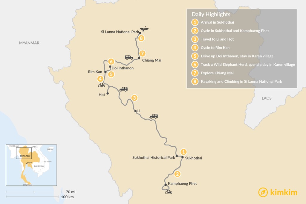 Get ready to spend a lot of time on your bike as you travel to villages in the rolling green hills of the countryside, taste incredible local flavors and home-cooked meals, and immerse yourself in the history of northern Thailand. You’ll explore the impressive temple ruins in the ancient city of Sukhothai, stay with the Karen tribe in their village, and hang out with a herd of wild elephants.