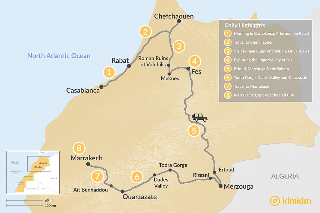 This eight-day loop from Casablanca to Marrakesh offers a perfect mix of imperial cities, smaller towns, and unforgettable desert adventures. You’ll start in the north with Casablanca, Rabat, Chefchaouen, and Fes before venturing into the desert for a camel ride and night under the stars at a desert camp, as well as exploring old caravan routes, oases, and fortified kasbahs. You’ll then cross the High Atlas mountains into bustling Marrakesh to wander souks and experience the lively Jemma el-Fna square.