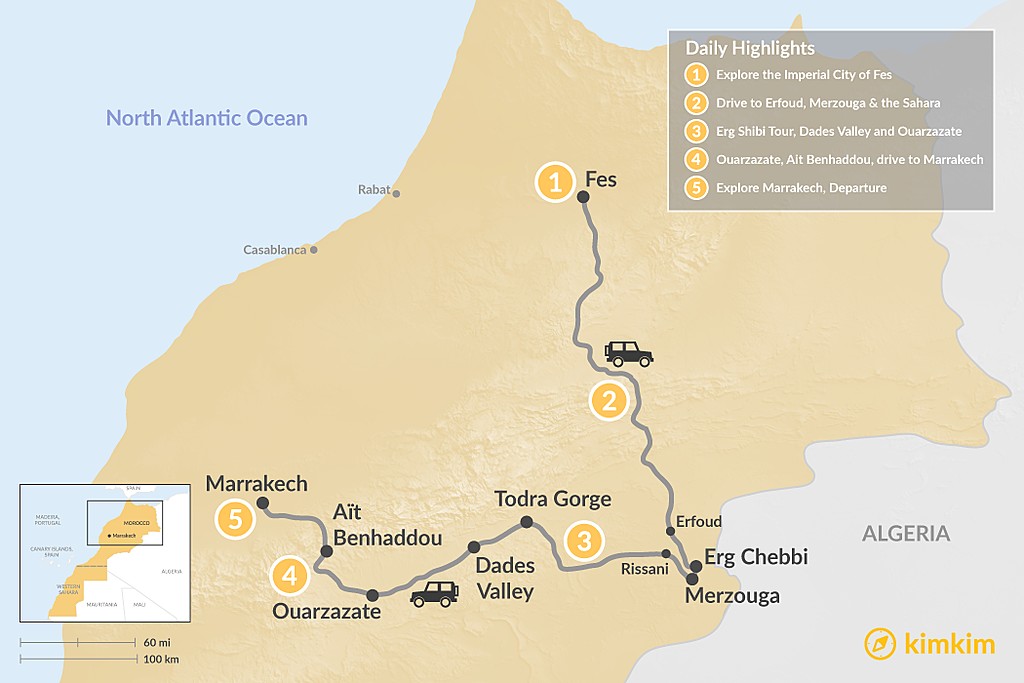 Map of A Taste of Morocco: Fes, Sahara Desert & Marrakech – 5 Days