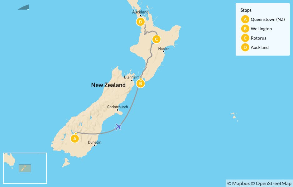 Map of A Taste of New Zealand: Queenstown, Wellington, Rotorua & Auckland – 8 Days