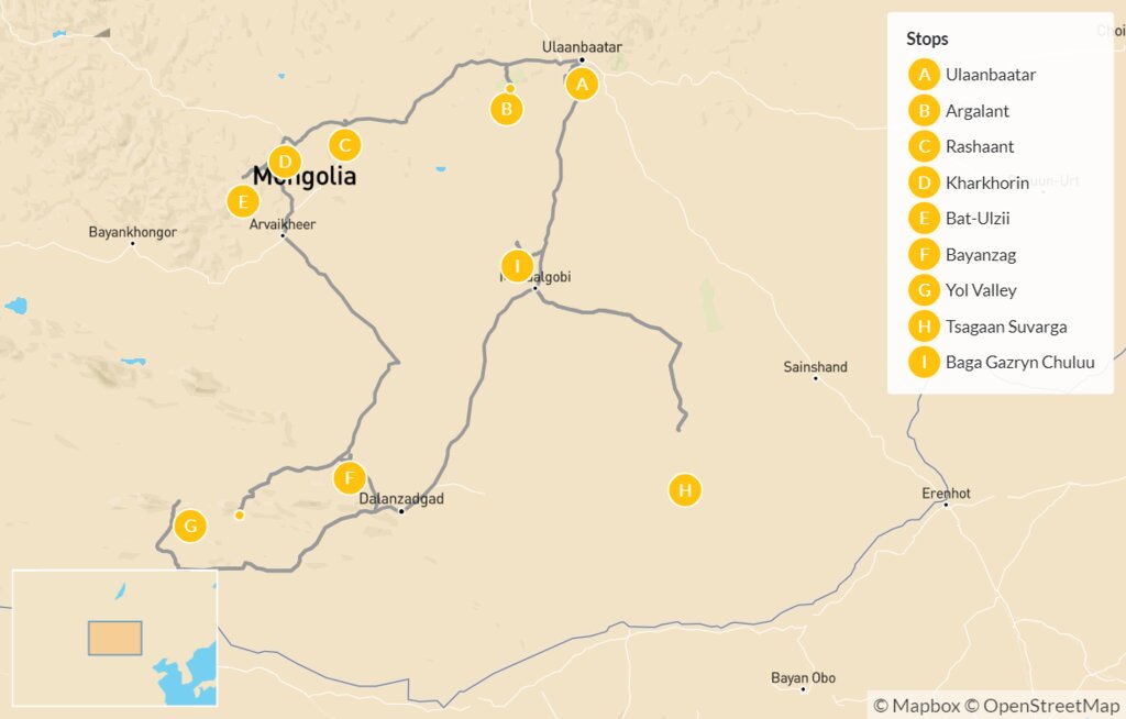 Map of Active Adventure Across Mongolia’s Epic Landscapes – 14 Days