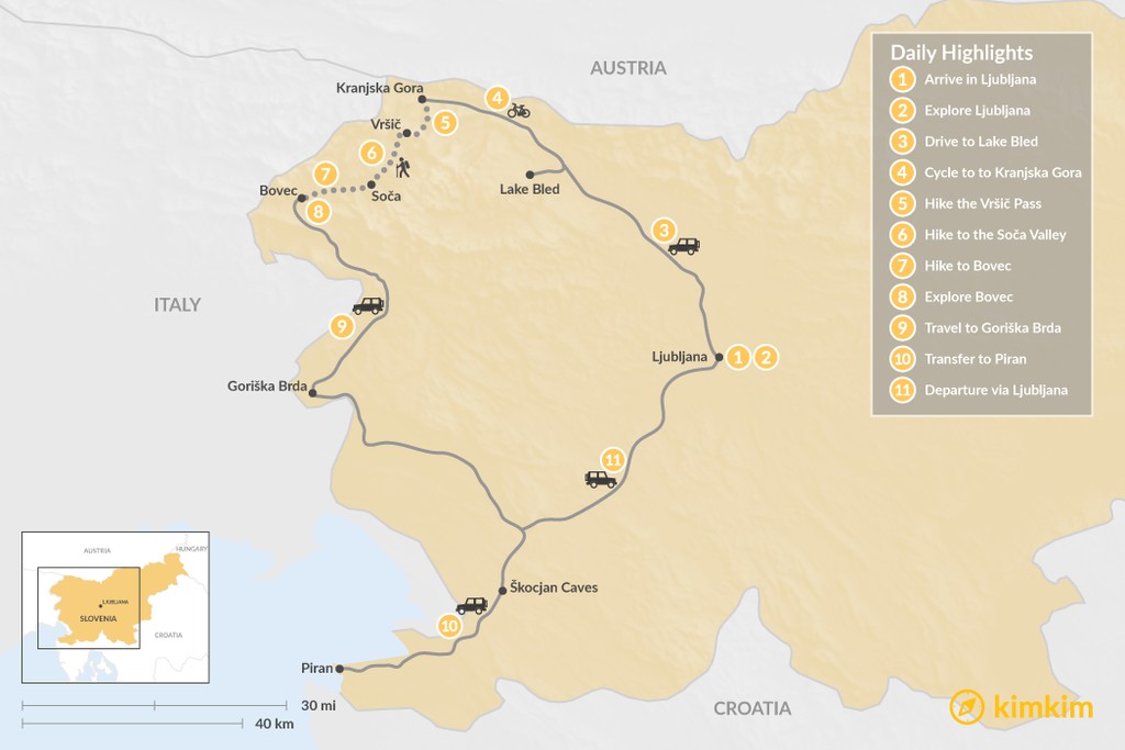 This active eleven-day itinerary takes you from the Alps to the Adriatic, through some of Slovenia’s most beautiful scenery. Bike from the bucolic shores of Lake Bled to the Alpine town of Kranjska Gora. Hike through Vršič Pass and into the Soča Valley, and finally cross the rolling hills of Goriška Brda to reach Piran on the Adriatic Coast.